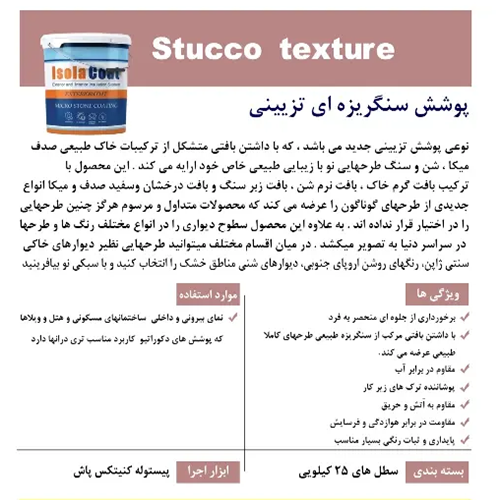 نوعی پوشش تزیینی جدید می باشد ، که با داشتن بافتی متشکل از ترکیبات خاک طبیعی صدف میکا ، شن و سنگ طرحهایی نو با زیبایی طبیعی خاص خود ارایه می کند . این محصول با ترکیب بافت گرم خاک ، بافت نرم شن ، بافت زیر سنگ و بافت درخشان و سفید صدف و میکا انواع جدیدی از طرحهای گوناگون را عرضه می کند که محصولات متداول و مرسوم هرگز چنین طرحهایی را در اختیاز قرار نداده اند . به علاوه این محصول سطوح دیواری را در انواع مختلف رنگ ها و طرحها در سراسر دنیا به تصور میکشد . در میان اقسام مختلف میتوانید طرحهای نظیر دیوار های خاکی سنتی ژاپن ، رنگهای روشن اروپایی جنوبی ، دیواره ای شنی مناطق خشک را انتخاب کنید و با سبکی نو بیافرینید