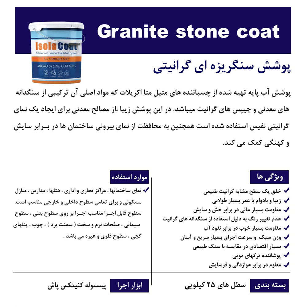 پوشش آب پایه تهیه شده از چسیانده های متیل متا اکریلات که مواد اصلی آن ترکیبی از سنگدانه های معدنی و پیپس های گرتمین میباشد.. در این پوشش زیبا ، از مصالح معدنی برای ایجاد یک نمای گرانیتی نفیس استفاده شده است همچنین به محافظت از نمای بیرونی ساختمان ها در برابر سایش و کهنگی کمک می کند .