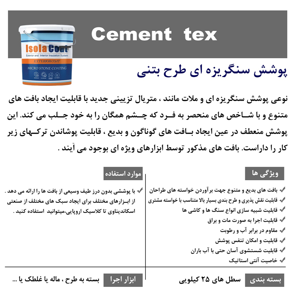 نوع پوشش سنگریزه ای و ملات مانند ، متریال تزیینی جدید با قابلیت ایجاد بافت های متنوع و با شاخص عای منحصر به فرد که چشم همگان را به خود جلب می کند . این پوشش منعطف در عین ایجاد بافت های گوناگون و بدیع ، قابلیت پوشاندن ترکهای زیر کار را داراست. بافت های مذکور توسط ایزارهای ویژه ای بوجود می آیند.